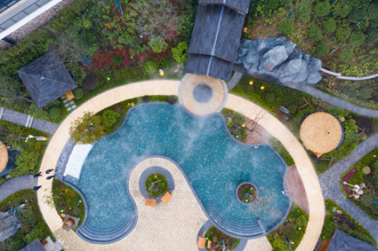 水墨田園温泉区には48の特色ある室外天然湧水風呂および約600平方メートルの屋内プール・各種スパがある。温泉区全体が、山水、緑林、田園が入り乱れた自然環境の中にすっぽりと位置しており、ここに身を置くと、山水の霊気、田園の風景、農耕の息吹に含まれる原生態の調べにたちまち溶け込んでしまう。水墨田園温泉の温泉水には微量の元素が含まれており、疲労を解きほぐし、美容や養生、健康を保つ効用がある。