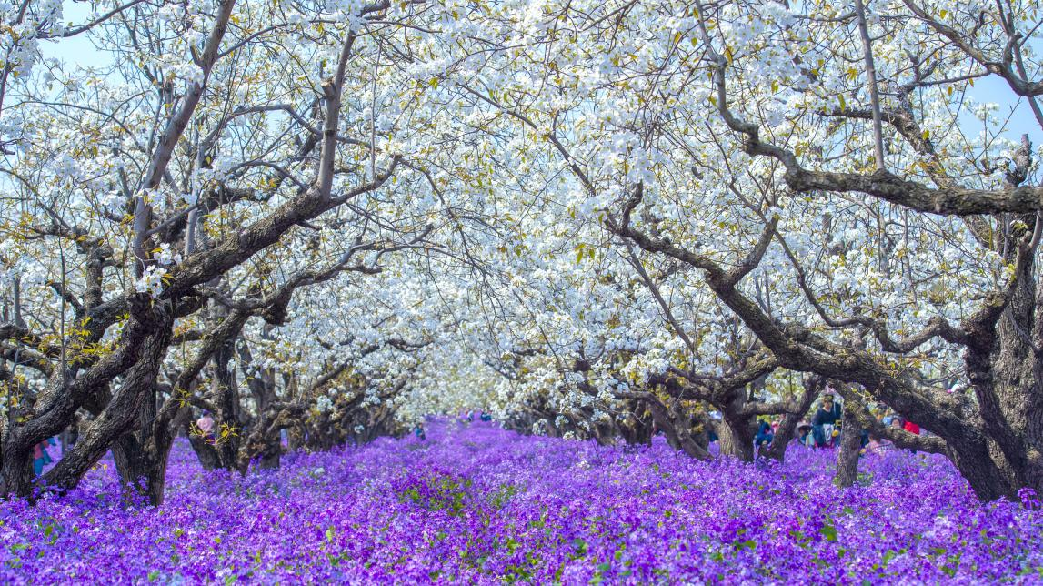 最初に止まる駅は梨香満園駅だ。ここではオオアラセイトウの花畑のなかにナシの木が植えられている。一本一本の枝に白いナシの花が満開となっている様子は雲か降り積もった雪のようだ。最盛期になるとオオアラセイトウたちが一年一度の鮮やかで美しい色彩で咲き誇る。