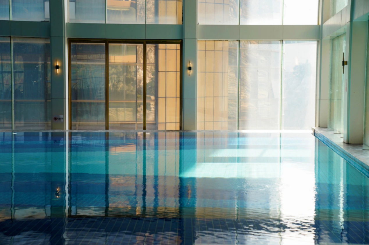ここの温泉は室内と室外に分かれている。室内には300平方メートルの恒温温泉プール、2つの子ども向け水遊びプール、特色あるミルク風呂、ラベンダー風呂、ワイン風呂などがあり、たとえ外の天気がどんなに寒くても、湯舟の中はずっと春のように暖かい。塩療房、熱石房、ヨモギ房、それにシアタールーム設備も完備されているので、友達や子どもと一緒に一日中「ひきこもり」が可能だ。