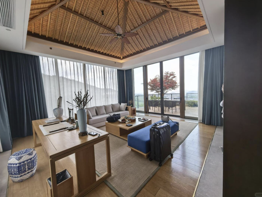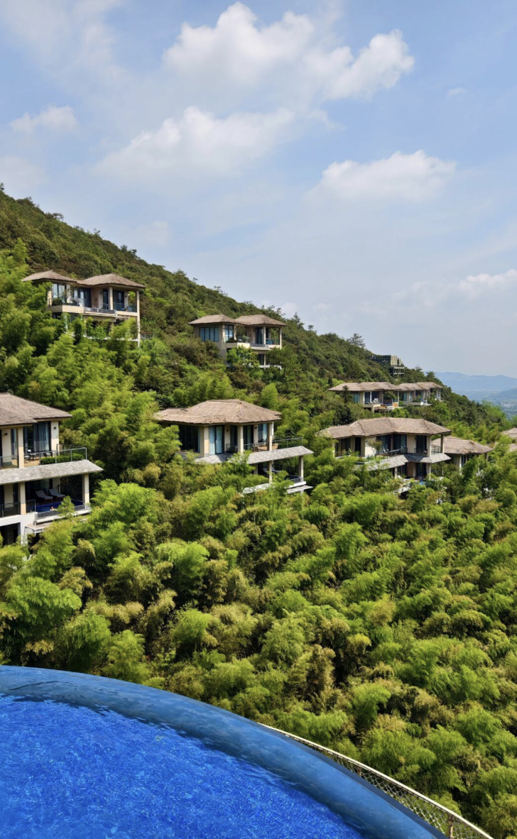 万畝の竹林に囲まれた丘の上に佇むこの宿は、池や湖にもほど近く、まさに絶景の自然美を満喫できるロケーションである。ホテルは深い竹林の中にひっそりと建ち、曲がりくねった小道の先に、静けさと癒しの空間が広がる。各ヴィラには専用のプライベート温泉が備えられており、湯に浸かりながら、眼前に広がる一面の竹海を眺めることができる。やわらかな湯に身を委ねれば、体の疲れも心の重さも、ふっと溶けてゆくような、極上のリラクゼーション体験が待っている。