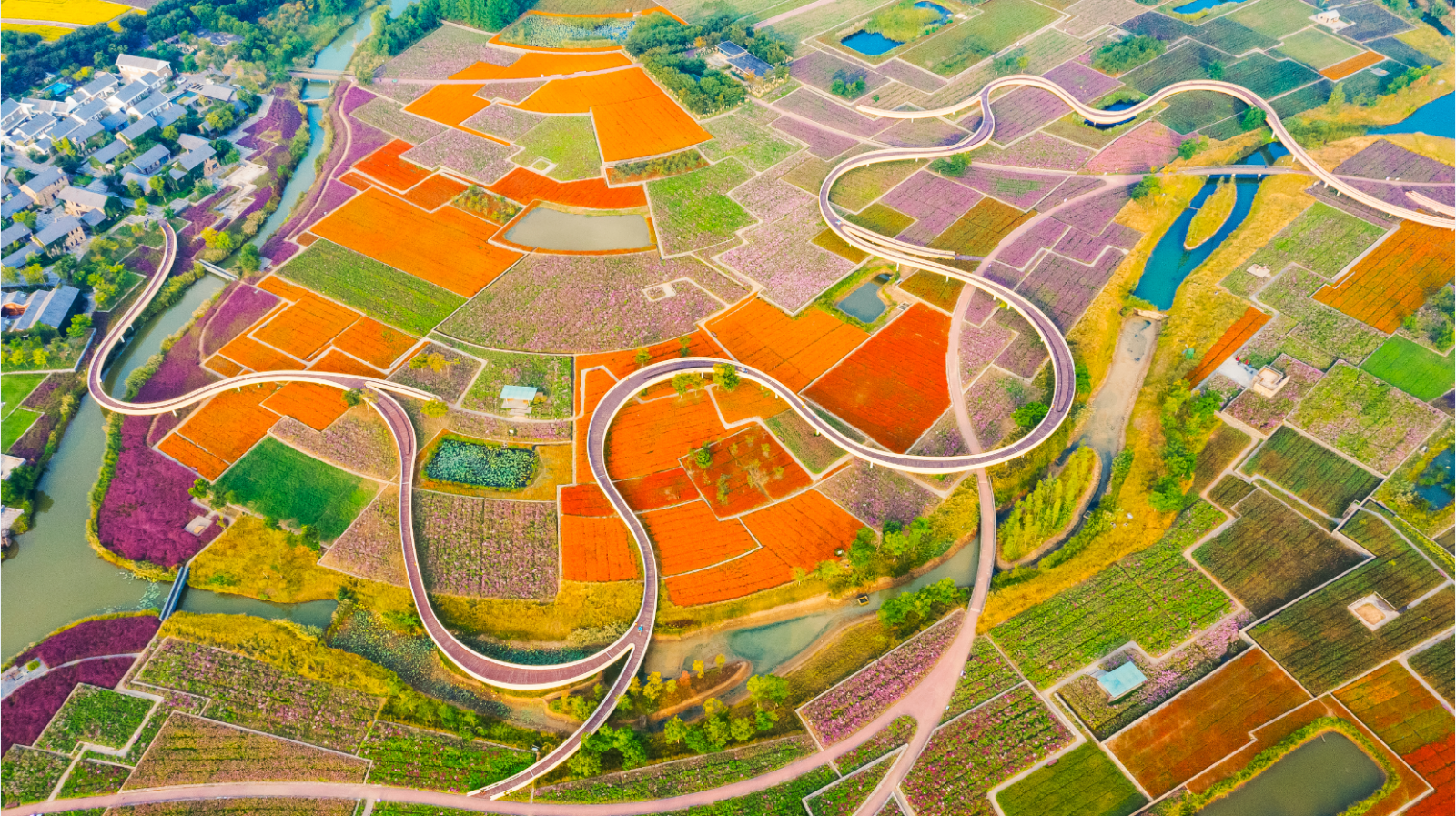 秋風が花の蕾が開き、三台山森林公園内の衲田は、またたく間に花の絨毯へと姿を変える。色で分かれた花畑では旬の花が咲きほこり、衲田花畑の上空にある2.3キローメートルの虹橋からは、延々と続く幻想的な花畑を一望できる。