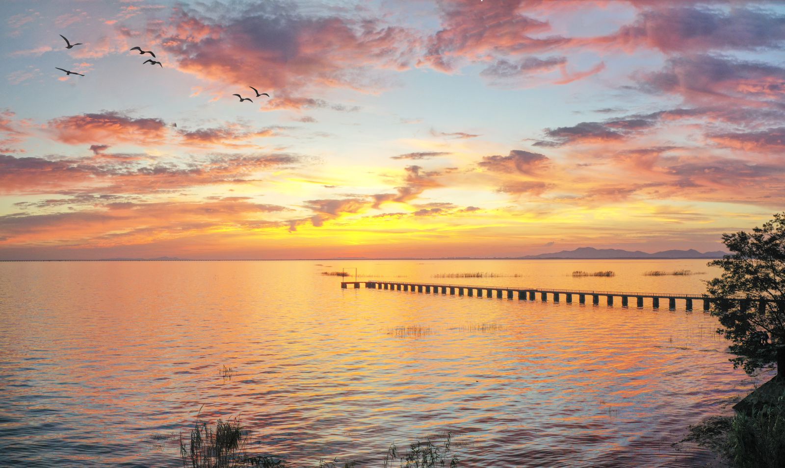 霊谷寺では詩的な秋に会えるというと、石臼湖では最もロマンチックな秋に会える。地下鉄S9号線に乗り前に進めば、雲も山も湖面に映し出し、水天一碧。水はまるで鏡のように空を映している。夕暮れの時なら、夕焼けは水面も染められる。光影の変化中、石臼湖は一編の絵巻物のように彩っている。
